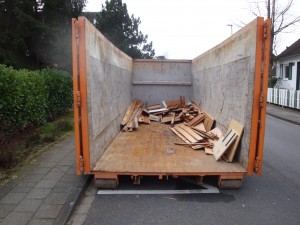 Später nehmen wir die normale Hausmülltonne dazu, um auch den Kleinkram geschickt in die große Metallkiste zu manövrieren. Bis der Hof leer geräumt ist, vergehen – man glaubt es kaum – 3 Stunden. Wer hätte gedacht, dass die Jungs letzte Woche SO viel Holz aus dem 1. Stock gekratzt haben. Daneben sehen die 5 Glaswolle-Säcke nahezu lächerlich aus. (Immerhin lächerlich genug, um sieben Leuten die Atemwege zu zerkratzen…)
