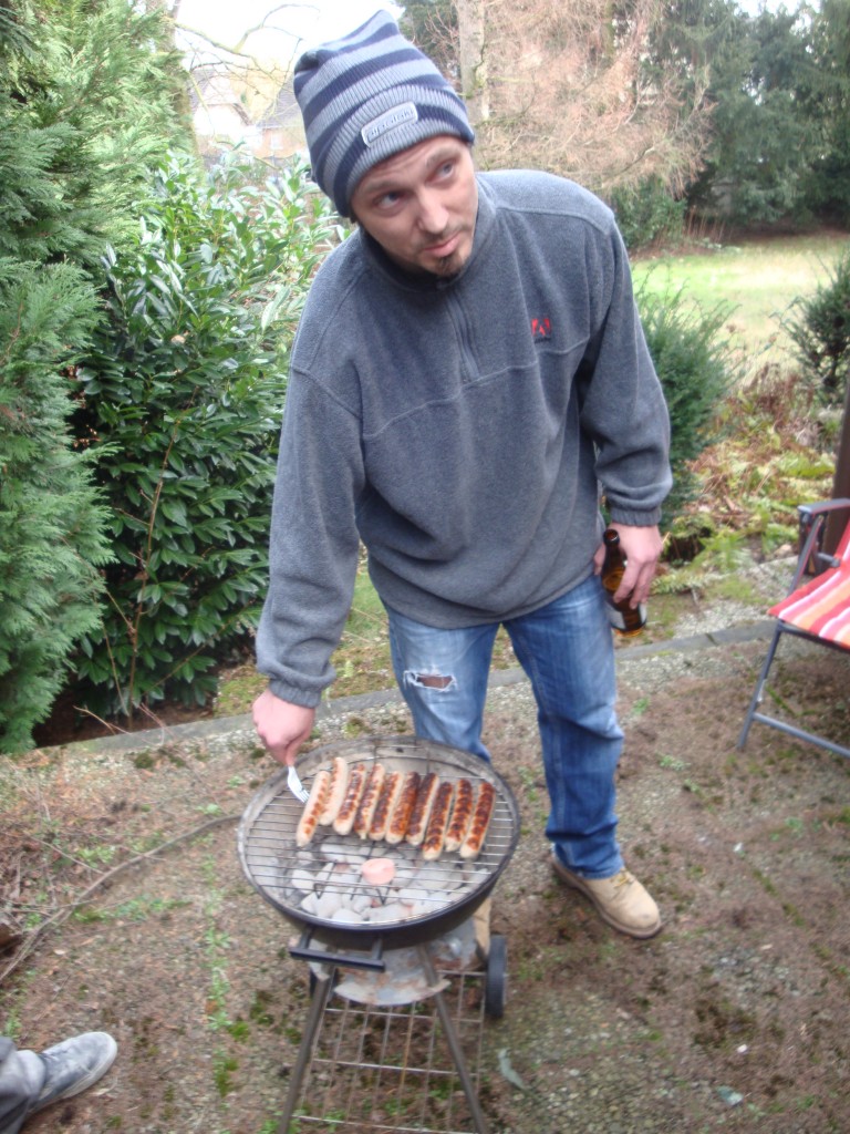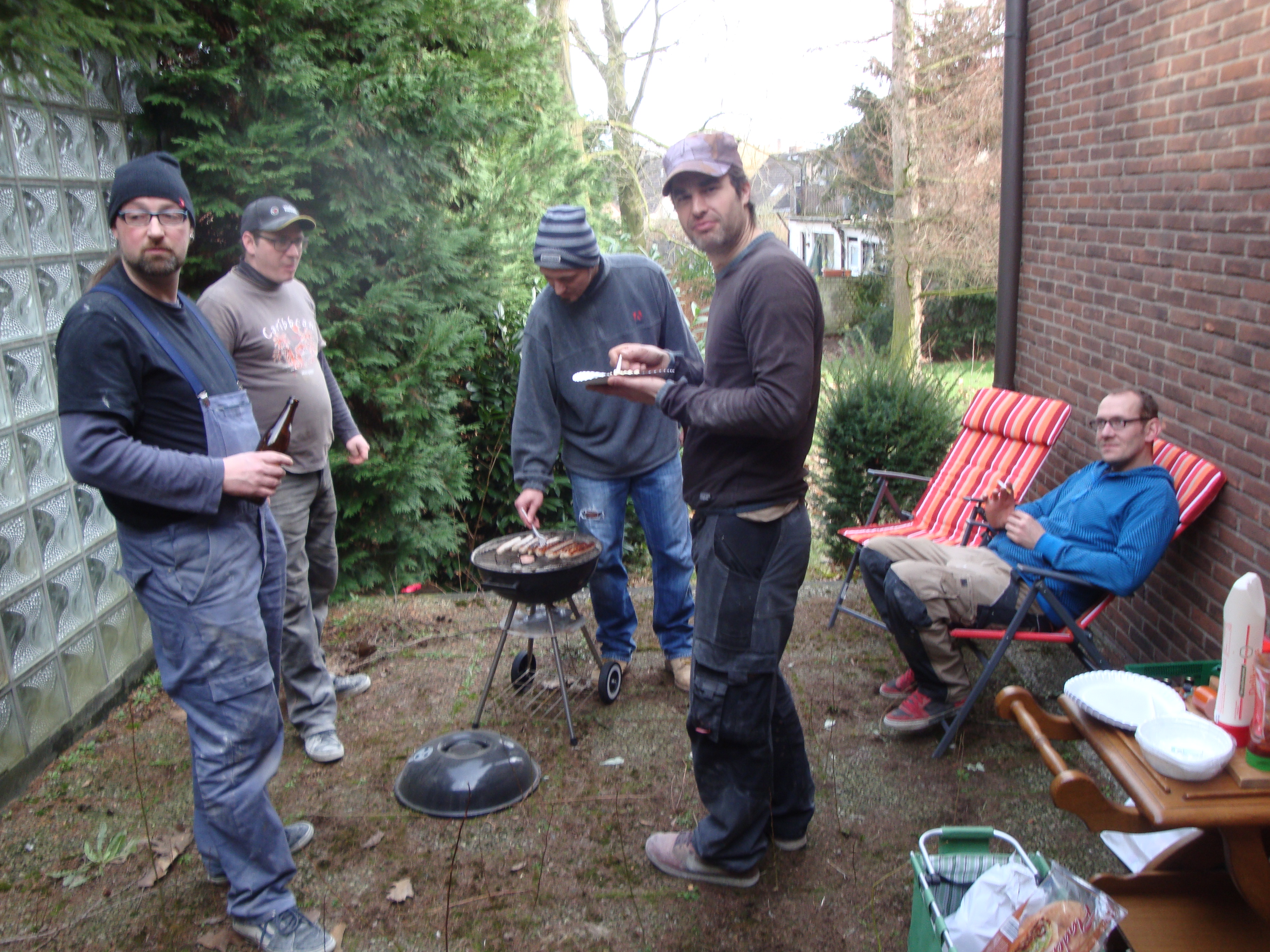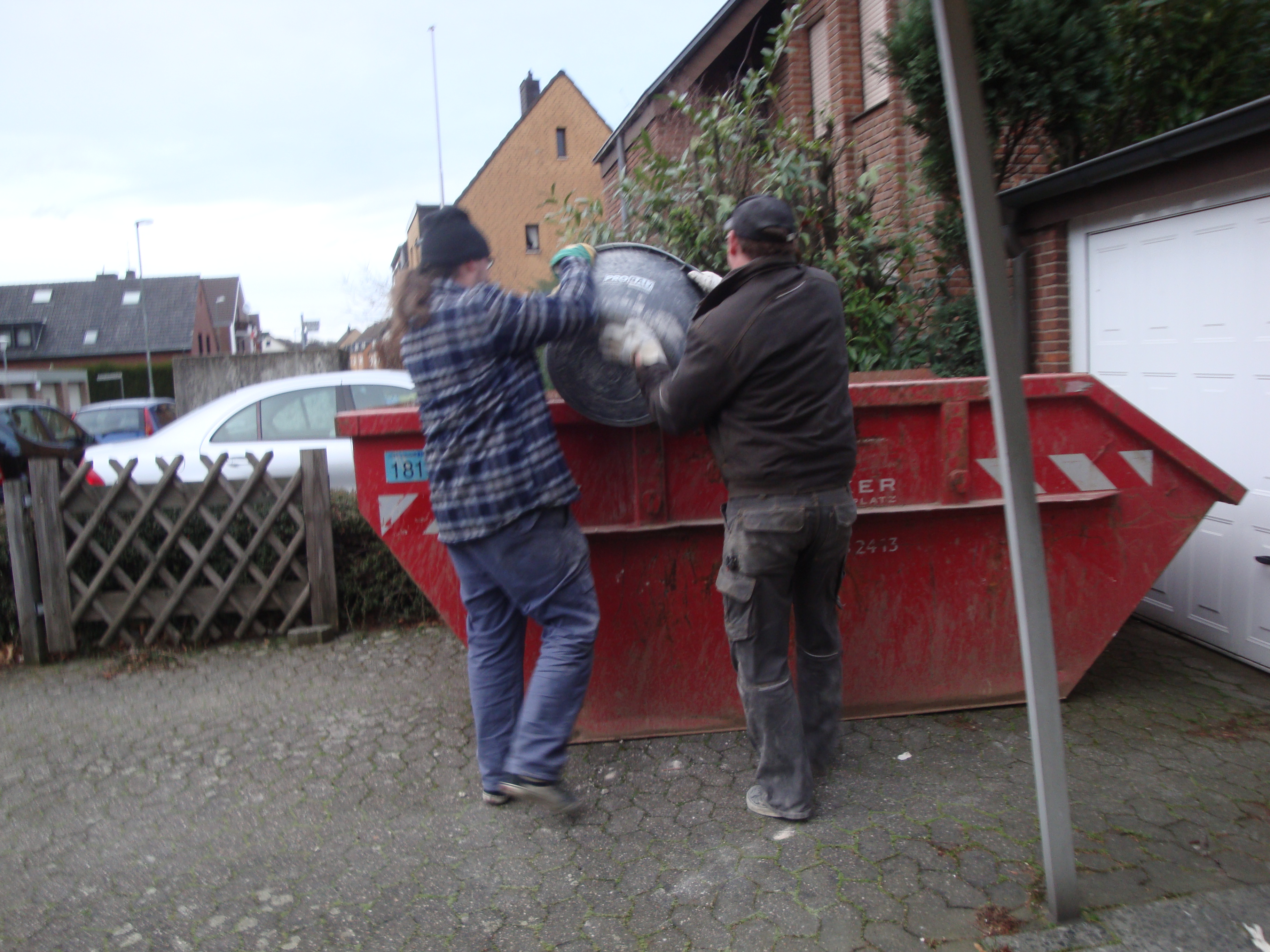 Um 10.00 Uhr sind Heavy und Torben schon an der Baustelle. Als ich um halb elf mit 20 Brötchen, Grillwurst und einer Schüssel Nudelsalat am Schauplatz ankomme, dauert es nicht lang, bis Timo mit dem 36m³-Höllen-Container vor der Tür steht.