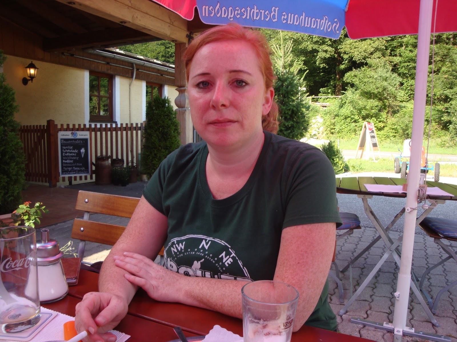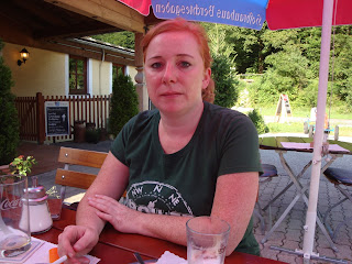 Nach der Besichtigung knurren die Mägen. Wir finden ein nettes Restaurant an der Almbachklamm mit direktem Blick auf den Watzmann. Heavys Schweinsbraten sieht lecker aus, und meine Spätzle sind ein Gedicht!