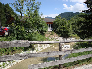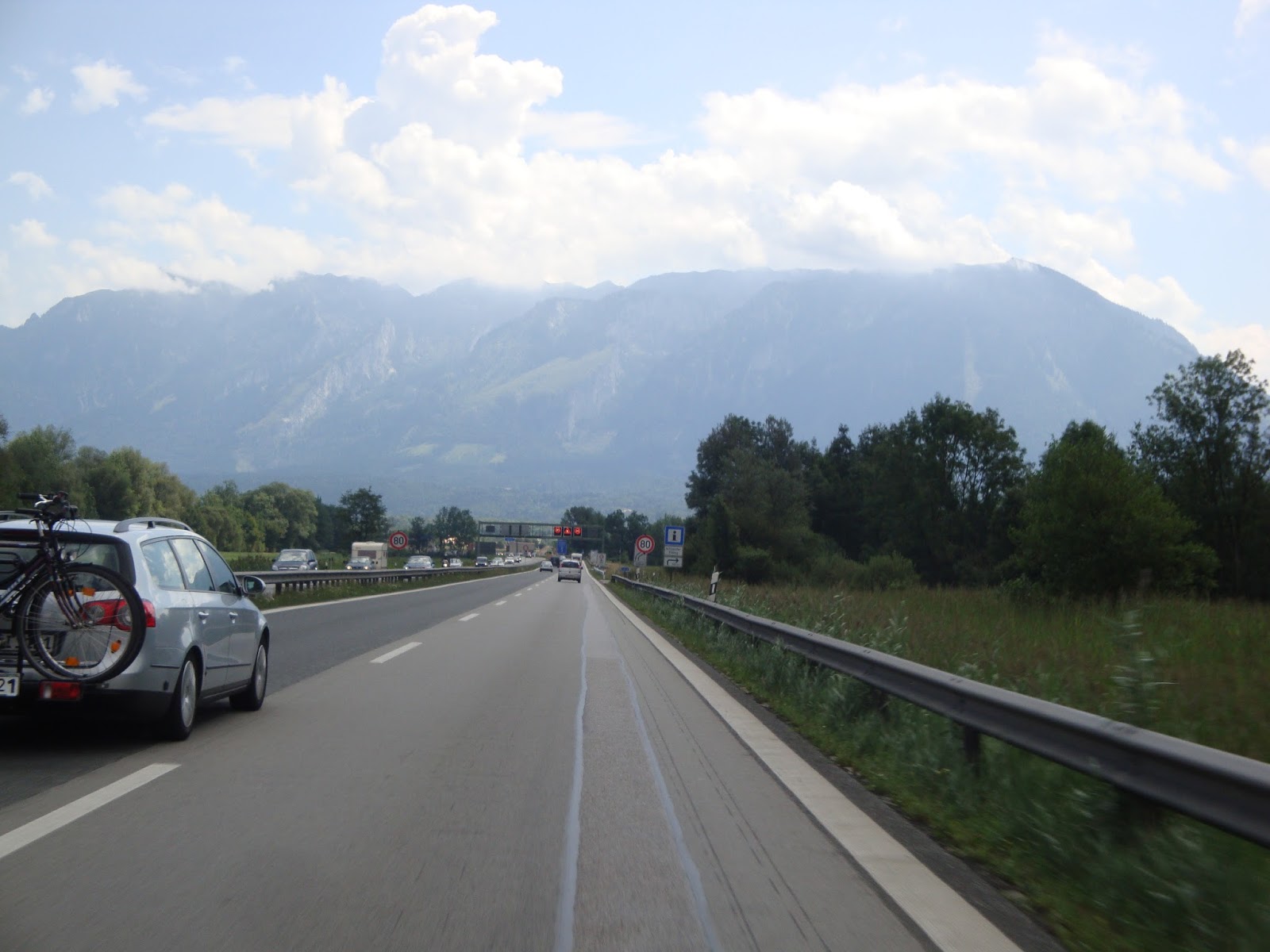 Mit Blick auf die Alpen geht’s über Bundesstraßen und später auch über die Autobahn (A8). In Salzburg überfahren wir die deutsch-österreichische Grenze, was eigentlich Autobahngebühr bedeutet. Weil Heavy aber in sein Buch vertieft ist und ich genug damit zu tun habe, die fremden Schilder zu interpretieren, geht dies völlig unter und fällt erst auf, als wir eine Mautkontrolle passieren – und durchgewunken werden. Irgendwie auch albern, für 5km Österreich Gebühren zu zahlen. Wir sind nicht sicher, ob diese minimale Strecke überhaupt bezahlpflichtig ist, beschließen aber, auf der Rückfahrt dasselbe Risiko einzugehen.