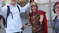 Die mit ihm posierenden Damen (eine sah aus wie Leni Riefenstahl) baten mich ein Foto anzufertigen, was den Mann mit dem Plastikschwert anschließend dazu veranlasste, ein lustiges Revanchefoto mit mir als Trottel und ihm als Casanova mit meiner Börsch einzufordern. (Eine Weltneuheit an Geschäftsidee und wohl auch Marktlücke… wenn er nicht versucht hätte mir mit seinem Plastikschwert die Familienjuwelen abzuschneiden. Hat zum Glück nich geklappt, trotzdem wollte der Kollege 2 Euro von mir für seinen Model-Job haben. Hatte ich aber nich‘ (ehrlich nicht, jedenfalls nicht klein!). Außerdem hat Leni alle Revanchefotos verbaselt. Und: Wir wollten das dämliche Foto gar nicht! Eine Stunde später wurde der Kollege dann von echten Centurios abgeführt… ich glaub wegen fehlender Aufenthaltserlaubnis… ich werde diese Militärs nie richtig verstehen…